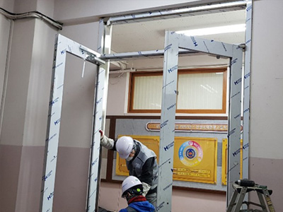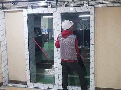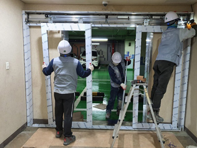 • 기존 프레임을 철거하지 않은 상태에서 신규 프레임 및 도어를 설치함으로써 소음 및 폐기물의 발생이 적고 마감공사 등의 추가 비용이 발생하지 않음