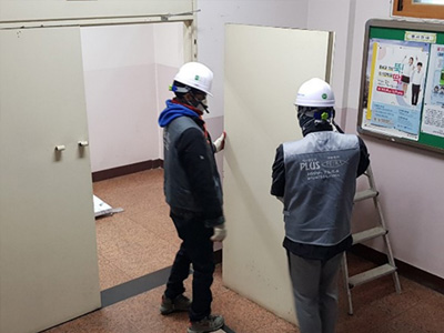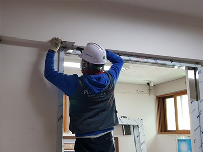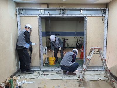 • 기존 프레임을 철거하지 않은 상태에서 신규 프레임 및 도어를 설치함으로써 소음 및 폐기물의 발생이 적고 마감공사 등의 추가 비용이 발생하지 않음